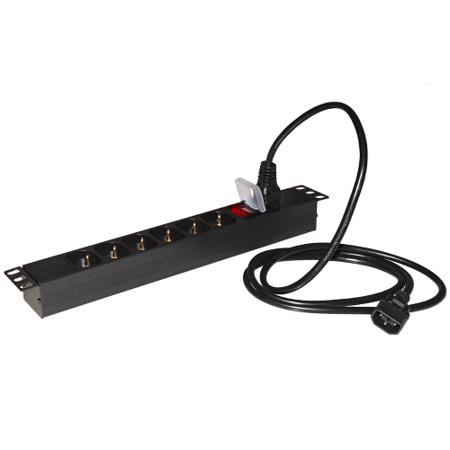 PRESA MULTIPLA PER ARMADI RACK 19'' CON INTERRUTTORE LUMINOSO CON CAVO C14 Multipresa con cavo maschio C14 removibile.Con un connettore maschio C20 per il collegamento alla rete elettrica, che permette il collegamento anche di altri tipu di cavi della lunghezza desiderata.Per alimentare i dispositivi all'interno degli armadi rack, si installa ai montanti laterali 19 pollici con le staffe incluse (reversibili).Sono incluse anche le viti per l'installazione sui montanti 19''.Con 6 prese universali Schuko tedesche e italiane tripolari UNEL 2P+T 16A femmina disposte a 35 gradi e un cavo C14 maschio.La disposizione delle prese a 35? permette il collegamento dei cavi spina tedesca a 90? Occupa 1 Unit?.250Volt 3500Watt.